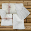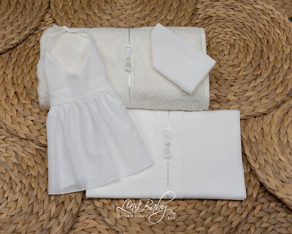 Βαμβακερό σετ λαδόπανου σε ιβουάρ ή λευκό χρώμα με διακοσμητική δαντέλα, σατέν τρέσα και φιόγκο με πέρλα.