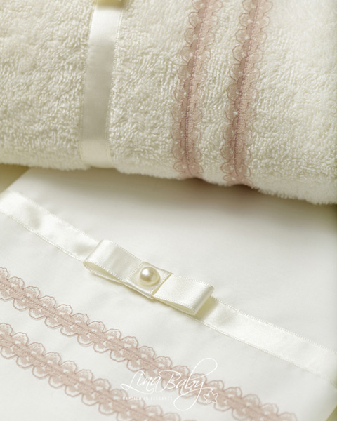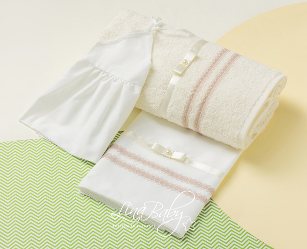Βαμβακερό σετ λαδόπανων σε εκρού απόχρωση, με διακοσμητική σατέν τρέσα, φιογκάκι με πέρλα και διπλή δαντελένια τρέσα στο υπέροχο χρώμα του σάπιου μήλου.