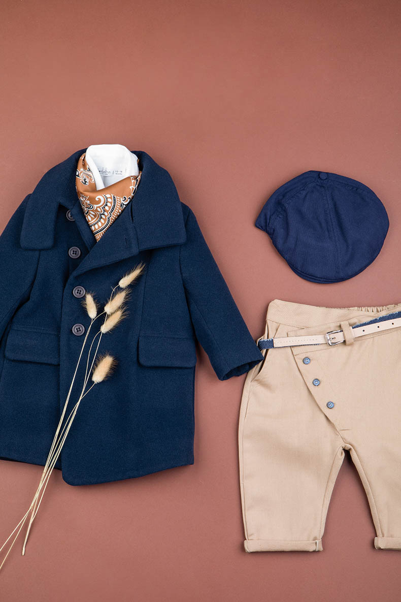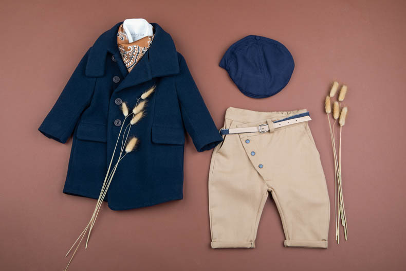 Συγκεκριμένα αποτελείται από μπλε βελούρ καπαρντίνα, λευκό πουκάμισο και ταμπά καπαρντίνα παντελόνι.