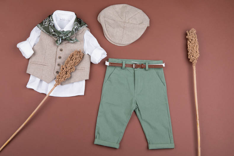 Αποτελείται από πράσινο παντελόνι, λευκό πουκάμισο και μπεζ γιλέκο με γιακά. Συνδυάζεται άψογα με υπέροχο μπεζ μπουφάν για ιδιαίτερη εμφάνιση.