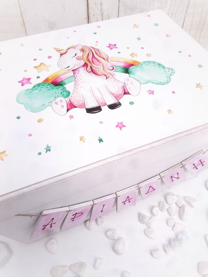 Σετ βάπτισης με χειροποίητο κουτί ζωγραφισμένο με θέμα τον μονόκερο.