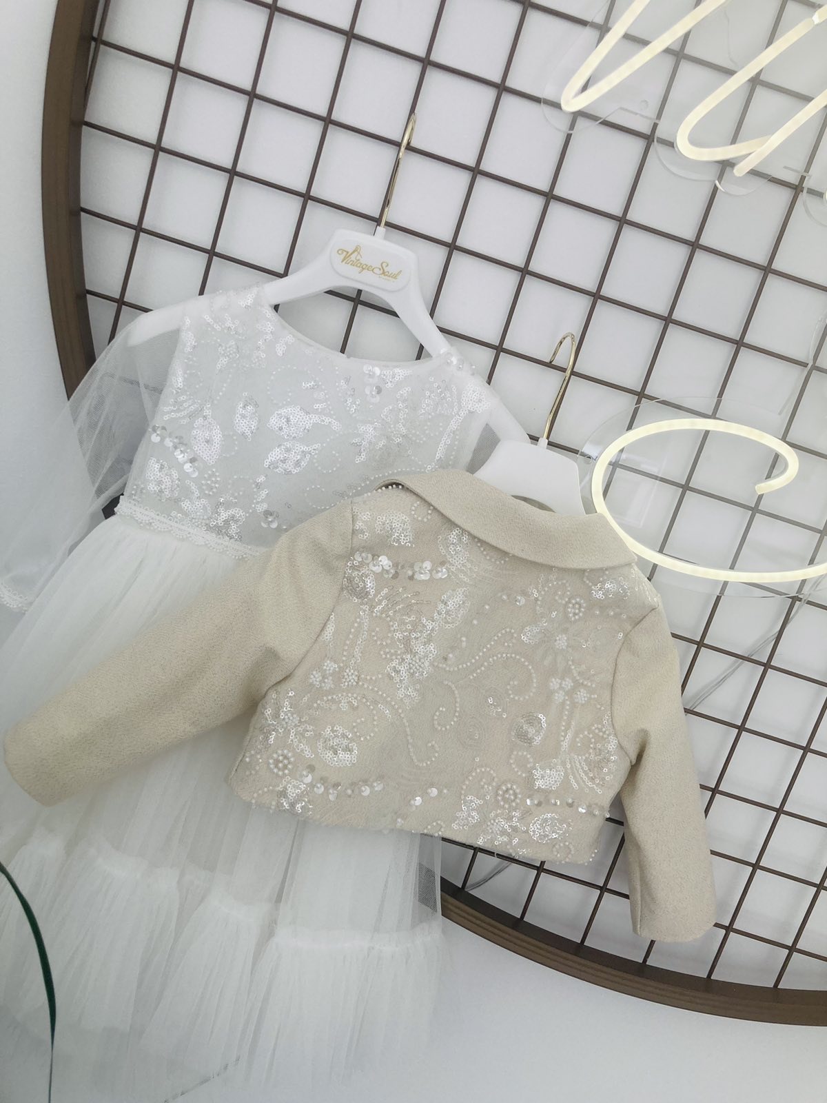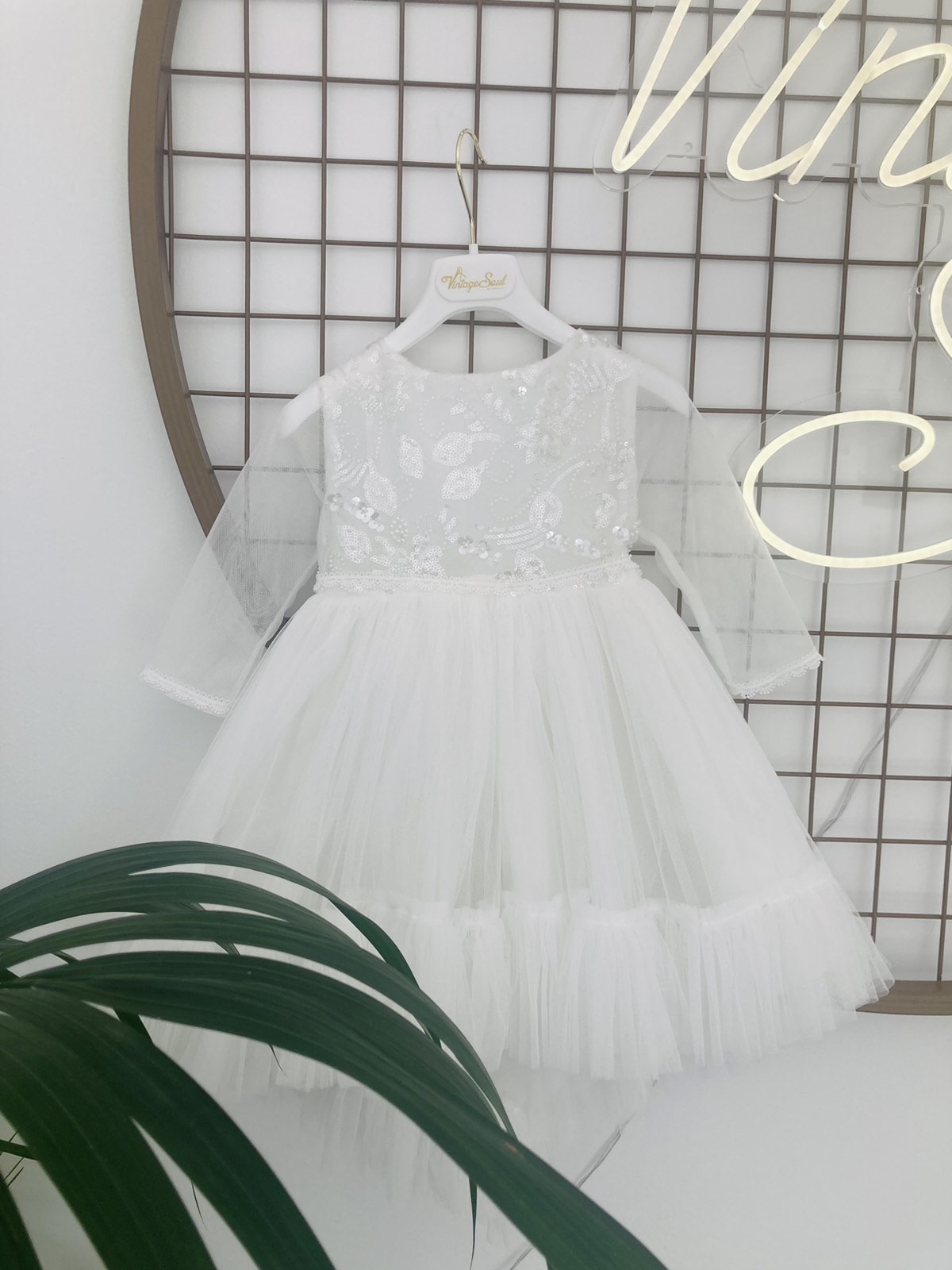 Χειμερινό βαπτιστικό φόρεμα σε ιβουάρ χρώμα με παγιέτα στο μπούστο, τούλινο μανίκι και μακριά ουρά.