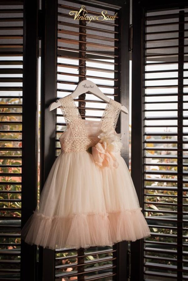 Φόρεμα από γαλλικό τούλι και απλικέ τρέσσα κοπανέλι σε ιβουάρ-σομόν ,με βολάν