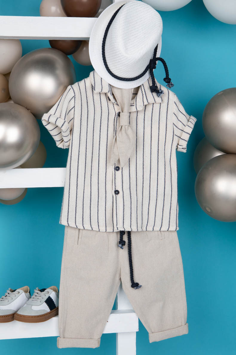 Αποτελείται από μπεζ πικέ παντελόνι διακοσμημένο με μπλε κουμπιά και πλεκτό ριγέ εκρού-μπλε πουκάμισο εξαιρετικής ποιότητας για να μείνει η εμφάνιση του παιδιού σας αξέχαστη.