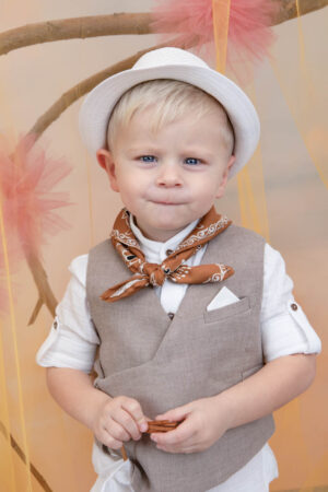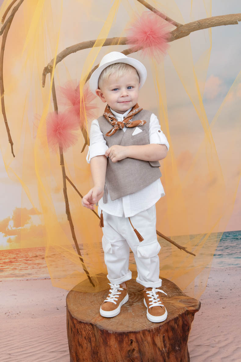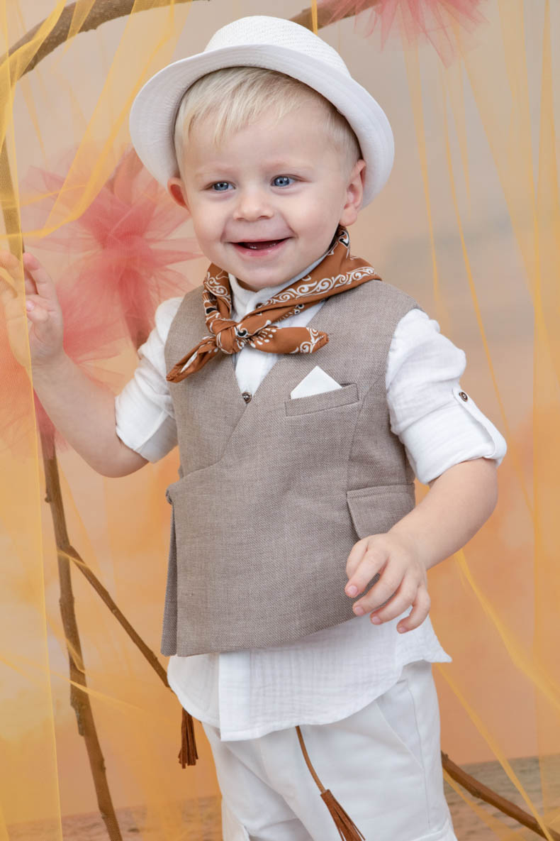 Ο Antouan είναι το απόλυτο chic bambolino boy που θα λατρέψετε. Αποτελείται από λευκό καπαρντίνα παντελόνι σε cargo σχέδιο, λευκή μάο μαλακή πουκαμίσα εξαιρετικής ποιότητας και νέο μπεζ γιλέκο με μοντέρνο στυλ χωρίς κουμπιά. Αξεσουάρ είναι το κορδόνι για ζώνη, το κεραμιδί φουλάρι με σχέδιο και το καβούρι του.