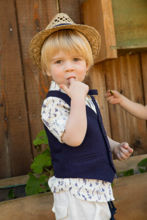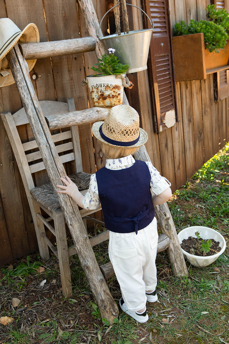 Αποτελείται από εκρού παντελόνι soft touch με μπλε κορδόνι στην μέση εκρού πουκαμίσα με λεβάντες σε loose fit γραμμή και μπλε γιλέκο βαμ/ρο.