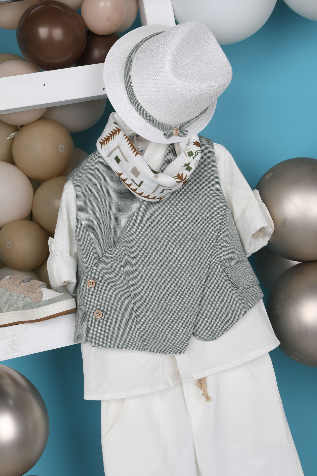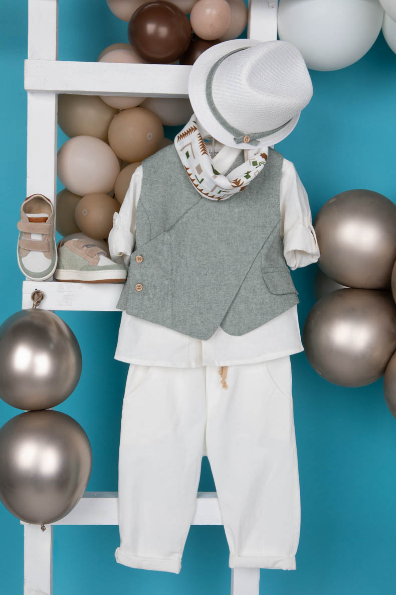 Ο Faidon είναι ένας all-time classic συνδυασμός σε μοντέρνα version. Αποτελείται από εκρού παντελόνι εξαιρετικής ποιότητας, εκρού λινό πουκάμισο και πράσινο γιλέκο διακοσμημένο με μπεζ κουμπιά. Αξεσουάρ είναι το μπεζ κορδόνι για ζώνη, το λευκό καβούρι και το printed φουλάρι του.