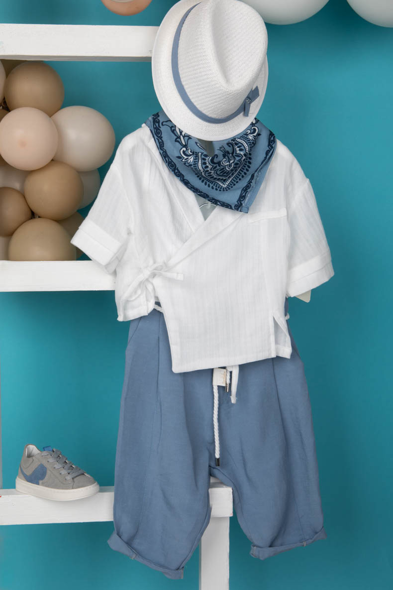 Αποτελείται από σιέλ ραφ παντελόνι εξαιρετικής ποιότητας και λευκή σταυρωτή πουκαμίσα.