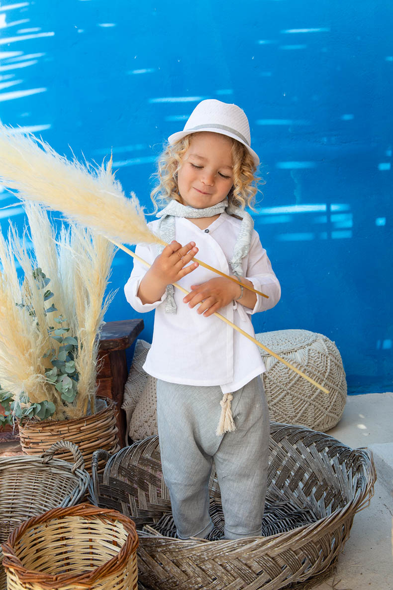 Αποτελείται από γκρι λοξό παντελόνι τύπου λινάρι και λευκή λινή σταυρωτή πουκαμίσα εξαιρετικής ποιότητας.