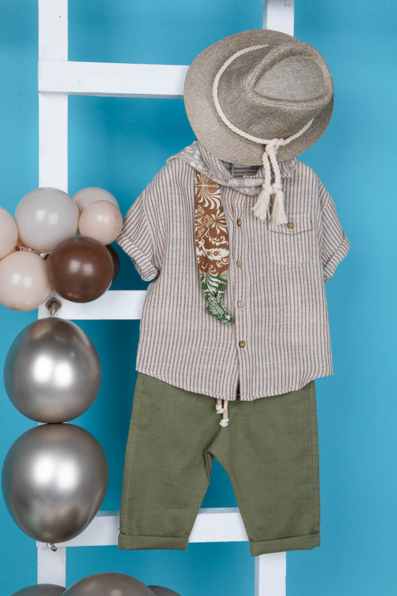 Ο Ionas είναι ένας πολύ μοδάτος και σύγχρονος συνδυασμός βάπτισης. Αποτελείται από λαδί λινό παντελόνι εξαιρετικής ποιότητας και ριγέ μπεζ–καφέ πουκάμισο με τσέπη.