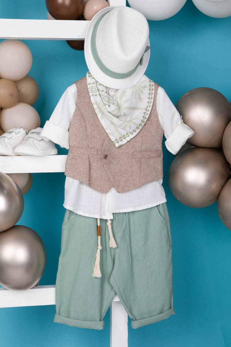 Αποτελείται από μέντα παντελόνι, λευκό λινό πουκάμισο με μάο γιακά και κέντημα εξαιρετικής ποιότητας και στραβό μπεζ γιλέκο με μοντέρνο κόψιμο.