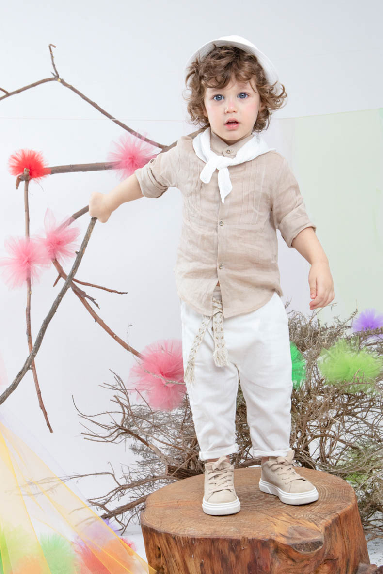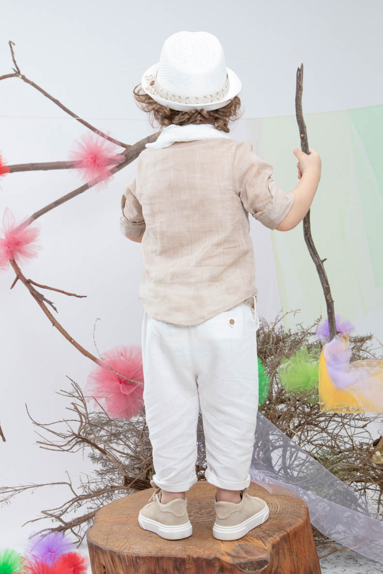 Ο Morty είναι μία νέα βαπτιστική τάση με πολύ στυλ. Αποτελείται από λοξό λευκό λινό παντελόνι διακοσμημένο με κουμπιά και μπεζ ramie πουκαμίσα εξαιρετικής ποιότητας.