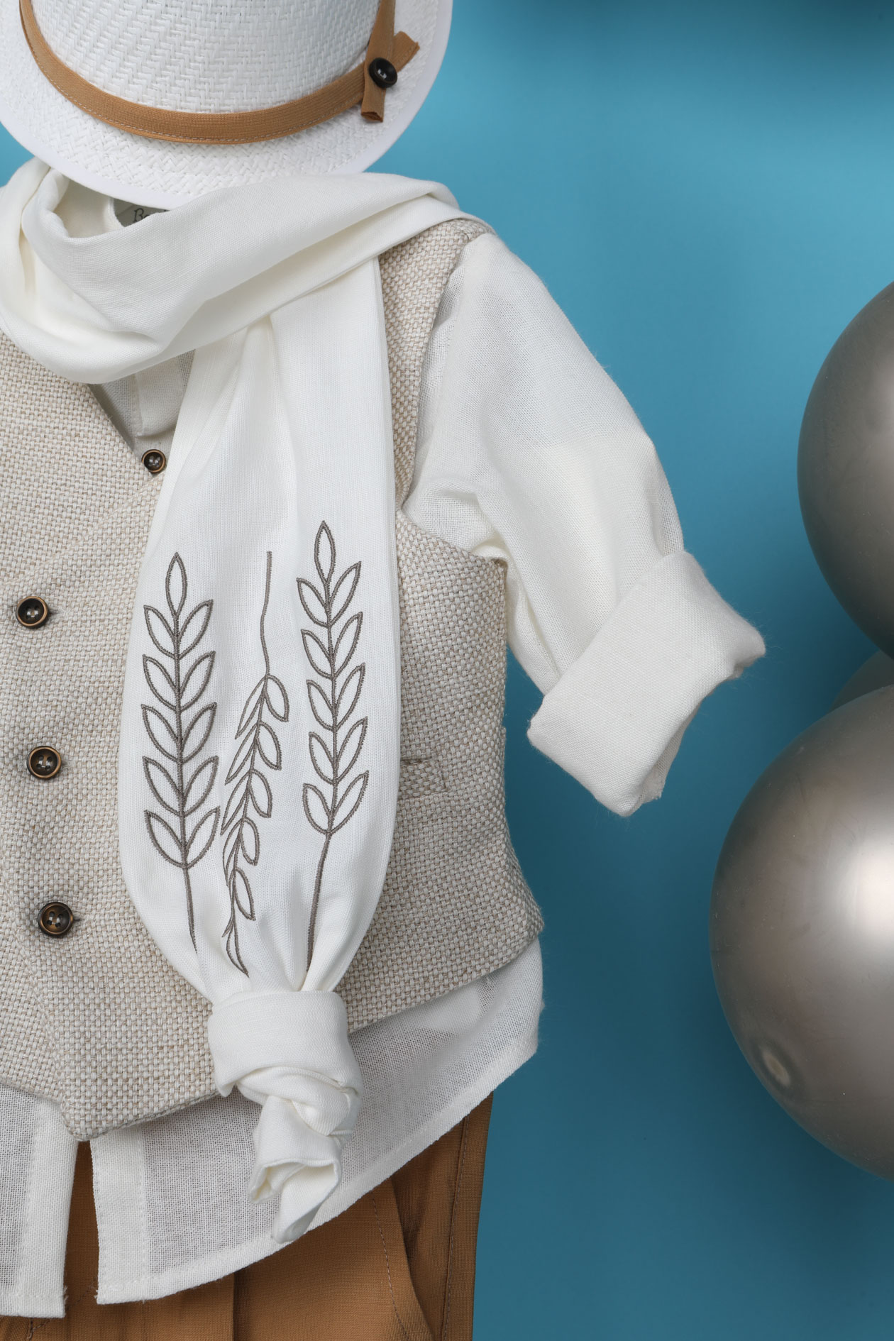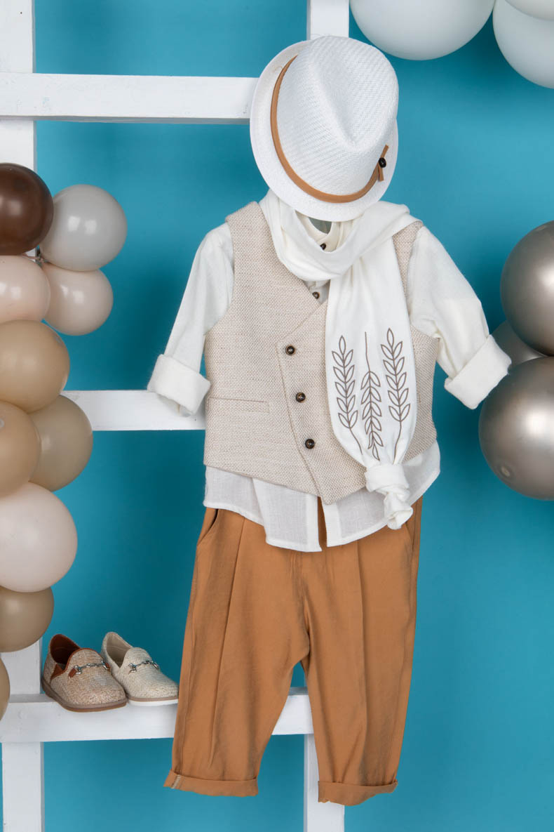 Ένας πολύ φρέσκος και ιδιαίτερος συνδυασμός βάπτισης είναι ο Nikitas. Αποτελείται από κεραμιδί παντελόνι, πουκαμίσα με νερβίρ γάζα και στραβό πλεκτό μπεζ γιλέκο. Αξεσουάρ είναι το λευκό καβούρι και το κεντημένο φουλάρι εξαιρετικής ποιότητας.