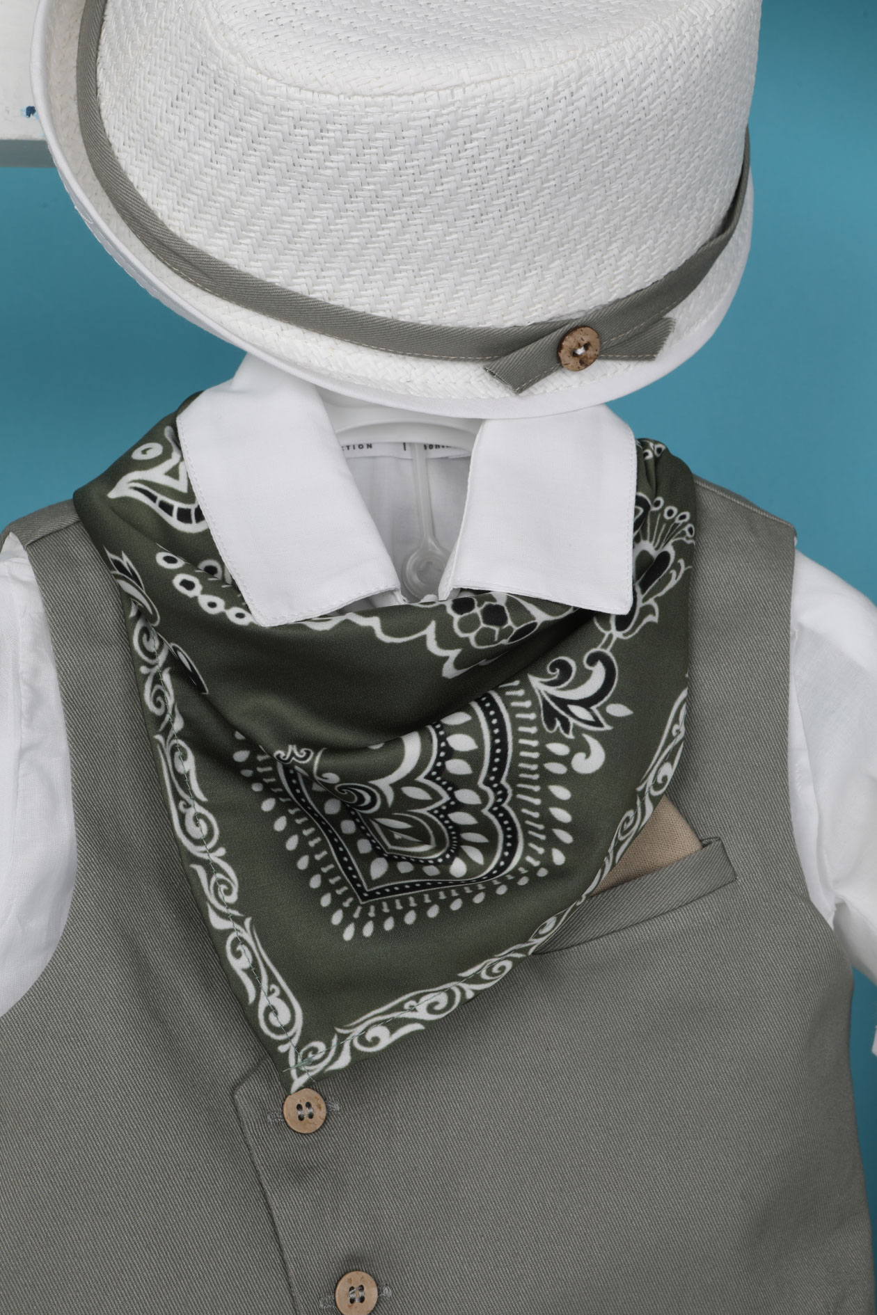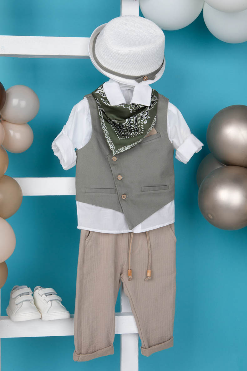 Αποτελείται από μπεζ γάζα παντελόνι, λευκό βαμβακερό πουκάμισο και στραβό λαδί καπαρντίνα γιλέκο εξαιρετικής ποιότητας.