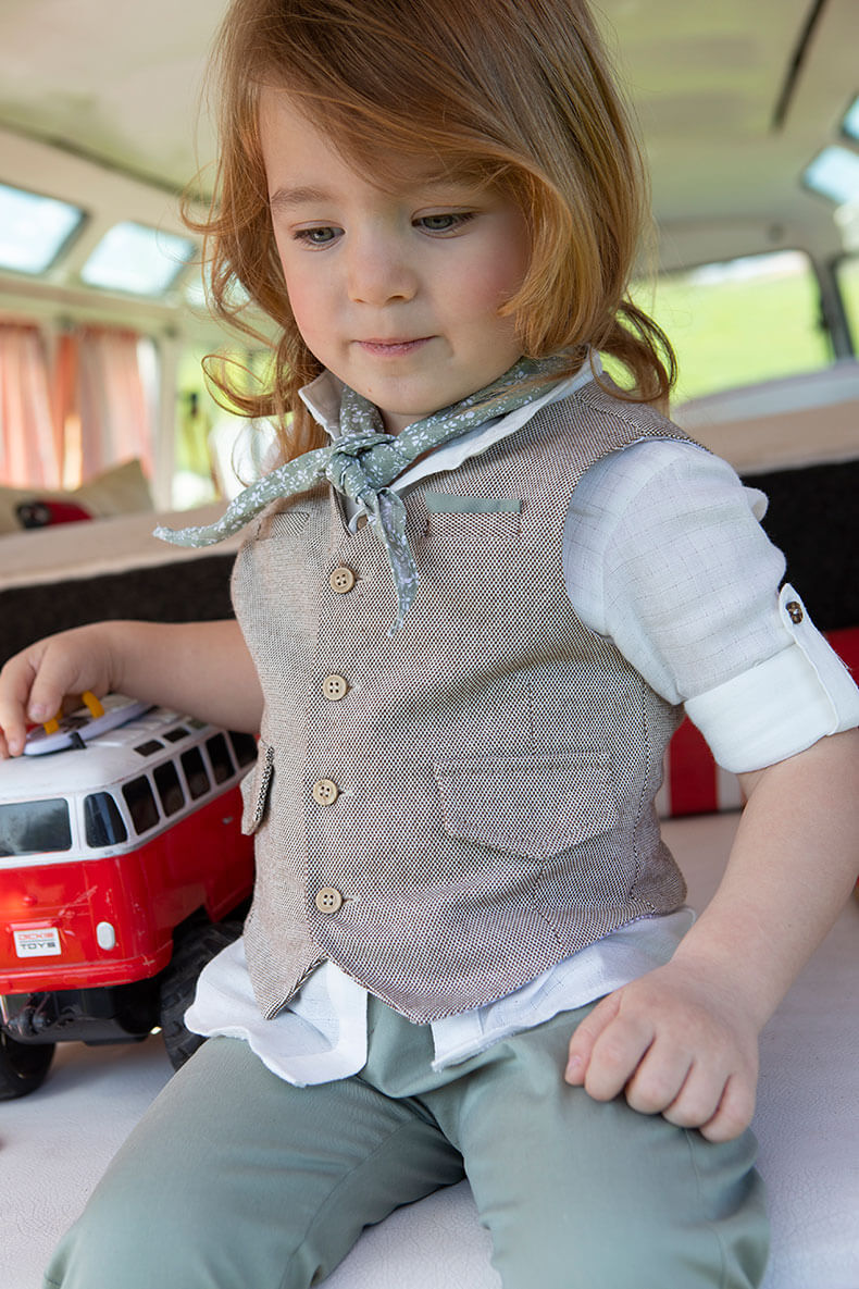 Αποτελείται από λαδί παντελόνι, εκρού οργανική πουκαμίσα και κλασικό μπεζ γιλέκο.