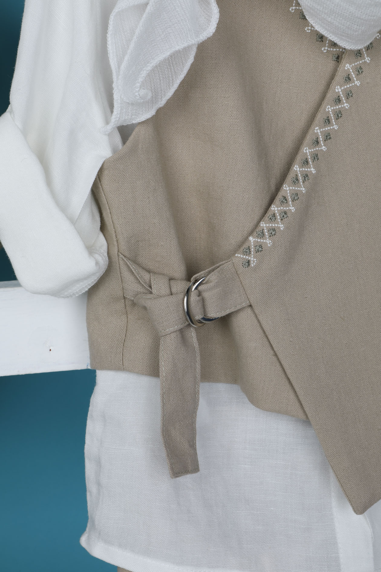 Αποτελείται από στραβό καφέ λινό παντελόνι με κουμπιά, μάο λινάρι πουκαμίσα και καφέ λινό γιλέκο με κρίκους. Αξεσουάρ είναι το εκρού κορδόνι για ζώνη, το φουλάρι γάζα και το λευκό καβούρι του.