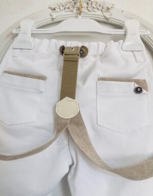 Παντελόνι 100% βαμβακερή καμπαρντίνα άσπρο, με κουμπιά εξωτερικά και φερμουάρ και διχρωμία στο χρώμα της άμμου στις τσέπες .