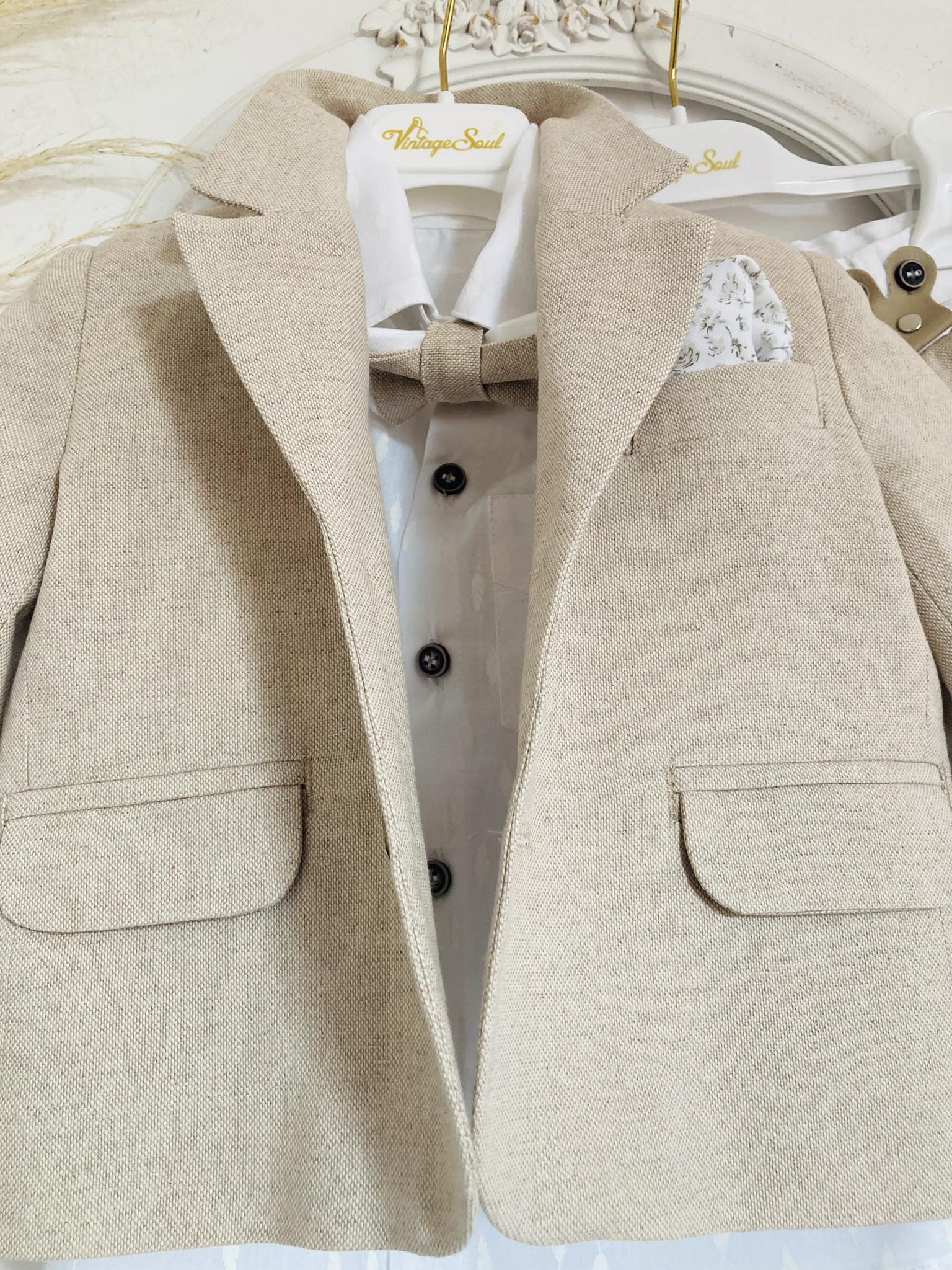 Σακάκι στο χρώμα της άμμου με διπλά κουμπιά και πουκάμισο λευκό με εκρού φυλλαράκι 100% βαμβακερά.