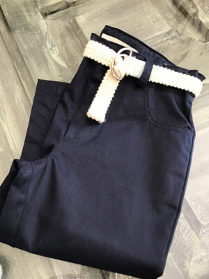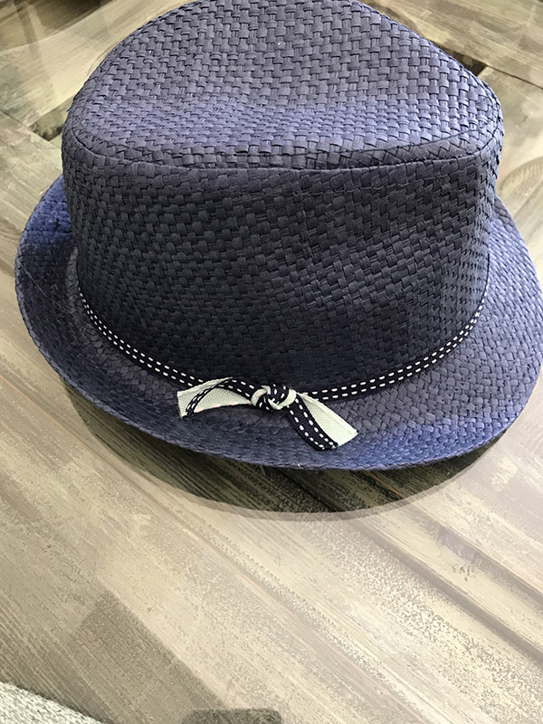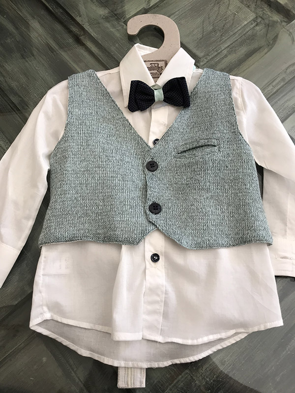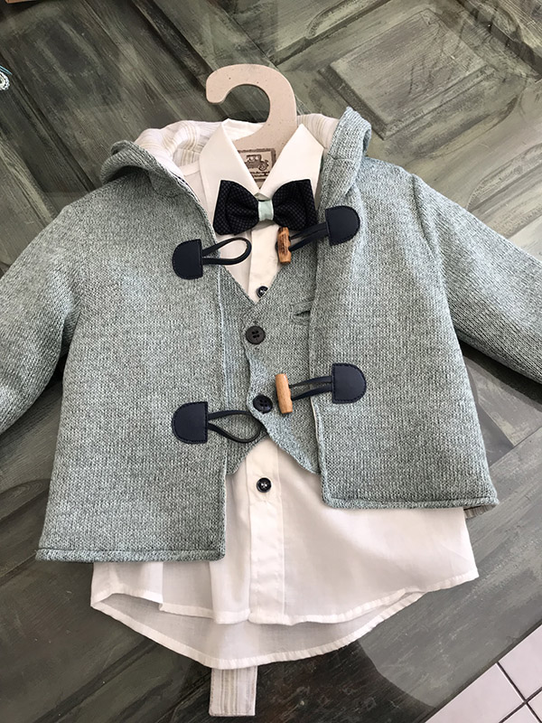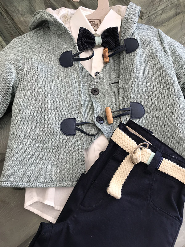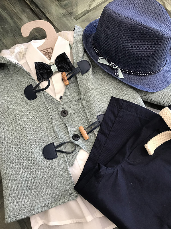 Το σετ περιλαμβάνει πλεκτό ζακετάκι σε βεραμάν χρώμα, ασορτί γιλέκο, μπλε σκούρο παντελόνι, λευκή ζώνη, μπλε ψάθινο καπέλο, παπιγιόν και λευκό πουκάμισο.