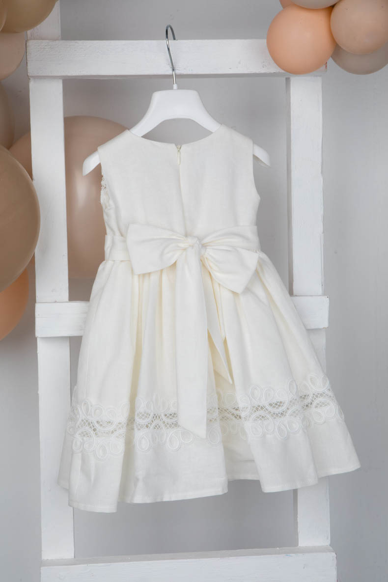 Η Rodopi είναι ένα αμάνικο εκρού baby chic λινό 100% φόρεμα βάπτισης με βαμβακερή δαντέλα εξαιρετικής ποιότητας. Το ρούχο ολοκληρώνεται με κορδέλα και λινό φιόγκο για το κεφάλι.