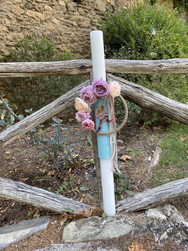 Η λαμπάδα είναι στολισμένη με στεφανάκι και ροζ- χρυσό plexiglass μονόγραμμα.