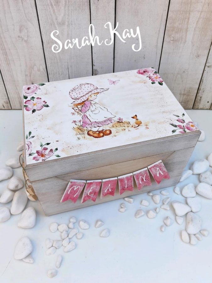 Σετ βάπτισης με ξύλινο ζωγραφιστό κουτί και με θέμα Sarah Key.
