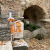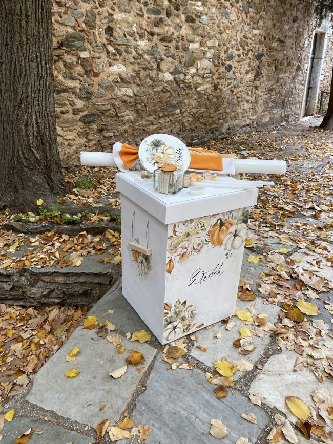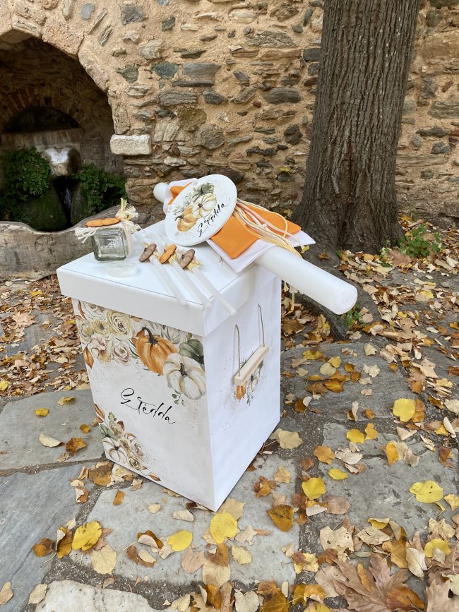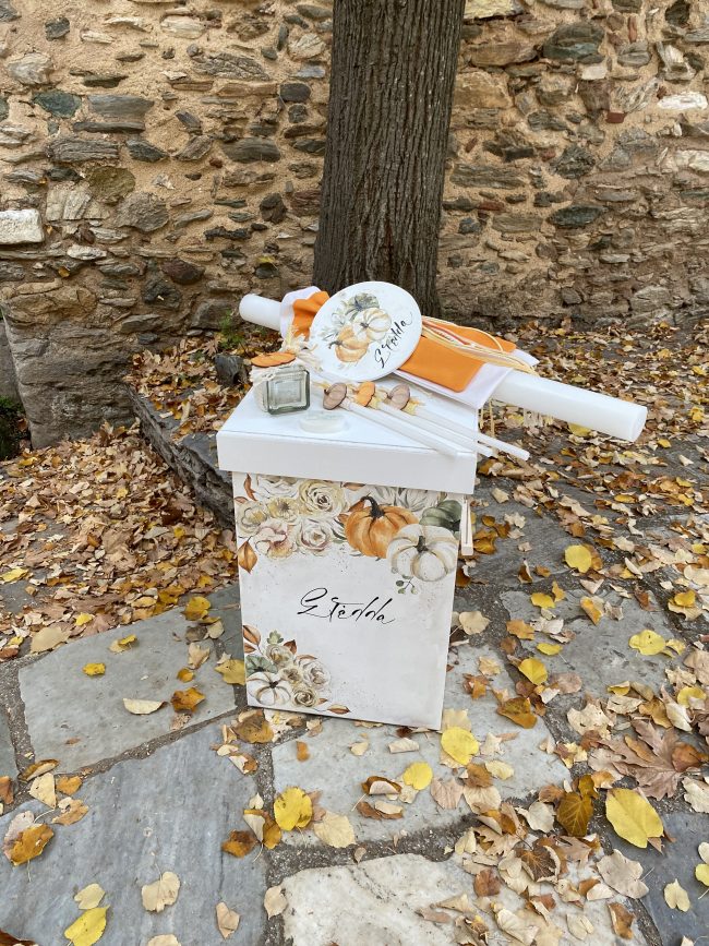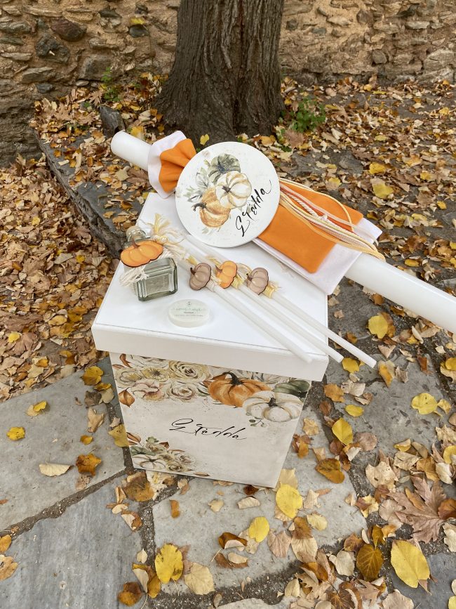 Σετ βάπτισης με ξύλινο ζωγραφισμένο κουτί με θέμα την κολοκύθα σε αποχρώσεις του πορτοκαλί, μπεζ και ιβουάρ.